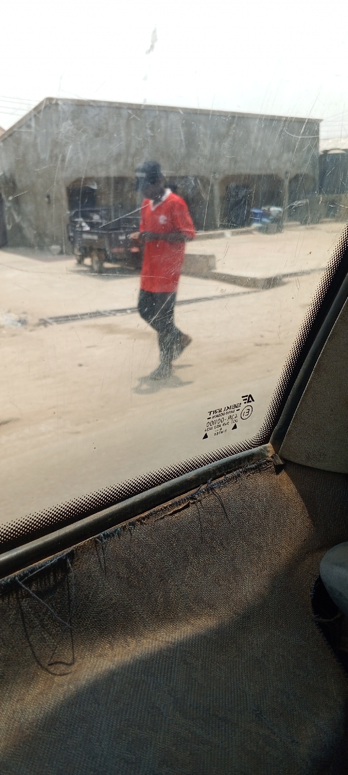 The scene depicts an outdoor environment in Laminga, Nigeria, viewed through a heavily scratched and dusty vehicle windshield. In the mid-ground, a dark-skinned individual walks from right to left. The person wears a red short-sleeved shirt with a white collar, dark trousers, dark shoes, and a dark baseball cap. The individual holds a small, dark object in their left hand. Shadows are cast on the light-colored, unpaved ground, indicating daylight conditions. In the background to the left, a single-story, unpainted concrete or stucco building with a flat roof is visible. A dark, three-wheeled cargo vehicle is parked in front of the building. The sky appears bright and overcast. The lower portion of the image reveals the dark, fabric-covered interior of the viewing vehicle, possibly a dashboard or door panel, with visible wear and loose threads. Manufacturer markings, including "SEKURIT" and "TIGILIK," are present on the windshield in the lower right quadrant.