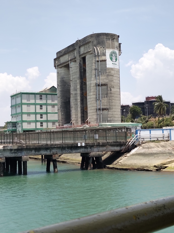 The image depicts an industrial waterfront scene under a clear sky with scattered white clouds, located in Mkomani ward, Kenya. In the midground, a large, weathered concrete industrial facility dominates the right side. This structure features multiple vertical sections, a prominent curved cylindrical component on its right, and displays a "Bamburi" logo with a green tree emblem. Ladders and maintenance platforms are visible on its exterior. To the left of this, another multi-story building with light green walls and numerous white-framed windows is situated. Separating these land-based structures from a body of turquoise water in the foreground is a concrete pier or bridge, supported by multiple robust concrete pillars submerged in the water. This structure features a dark metal fence or railing along its top surface. Adjacent to the large concrete facility, above the pier, a platform with reddish-orange safety railings is visible. On the far right in the background, a cluster of large industrial storage tanks, some dark and some with red tops, are visible on an elevated landmass, alongside a solitary palm tree and other vegetation. A white and blue structure is also visible on the land near the water's edge, adjacent to a concrete embankment. The immediate foreground shows a blurry, dark metallic rail extending horizontally across the bottom of the frame, indicating the vantage point is from a watercraft or elevated platform. No individuals or active interactions are visible in the scene.
