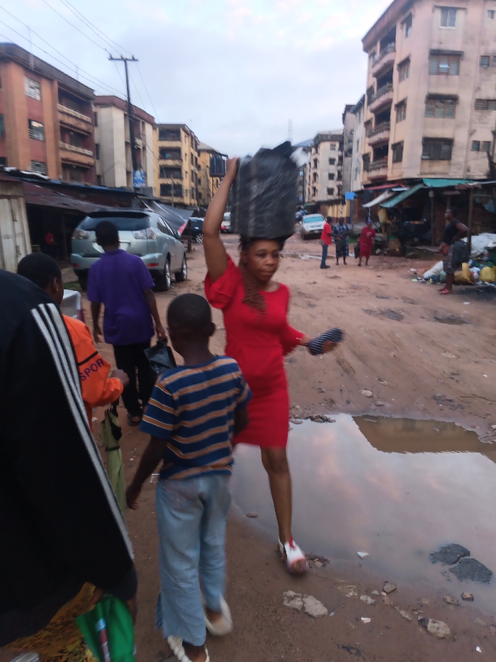 The image depicts a bustling, unpaved urban street scene in Onitsha, Nigeria, characterized by multi-story buildings and commercial activity. The location appears to be a mixed-use residential and commercial district. In the immediate foreground, obscured on the left, is a partial view of an individual wearing an orange shirt with black trim and white lettering that reads "SPORT." To their right, a young boy, seen from behind, walks towards the left, wearing a blue and brown horizontal striped short-sleeved shirt, light blue jeans, and light-colored shoes. Adjacent to the boy, a woman in a red short-sleeved dress walks towards the left, balancing a large, dark-colored, possibly black, bag or container on her head. Her right arm is raised to stabilize the load, and her left hand holds a black and white striped object, possibly a slipper or small bag. She wears white shoes with red accents and navigates a muddy section of the dirt road, stepping near a significant puddle. In the midground, a man in a purple short-sleeved shirt and dark trousers walks away from the camera, carrying a dark bag in his left hand. He is positioned near a parked silver Lexus RX SUV. Further down the street, on both the left and right, several other indistinct individuals are visible. The background features numerous multi-story buildings, typically three to five floors, with balconies, lining both sides of the unpaved, reddish-brown dirt road. These structures appear weathered, indicating age. Overhead electrical wires are visible against the overcast sky, which suggests either a cloudy day or late afternoon/early evening. On the right side of the street, several makeshift market stalls or shops with corrugated metal roofs and tarpaulin coverings are present. Adjacent to these stalls, a pile of discarded materials or garbage is visible. The road itself is uneven, muddy, and contains several puddles, one prominently reflecting the sky and buildings in the lower right.