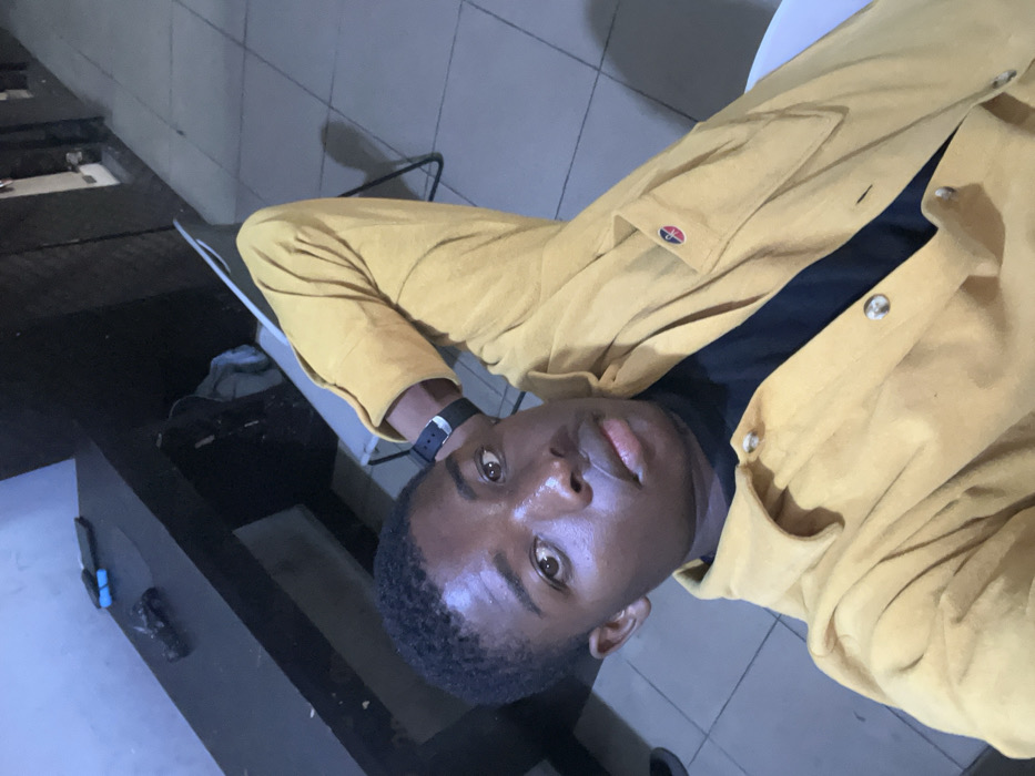 A young male is depicted in a close-up, self-portrait style image, taken indoors in Gura Top, Nigeria