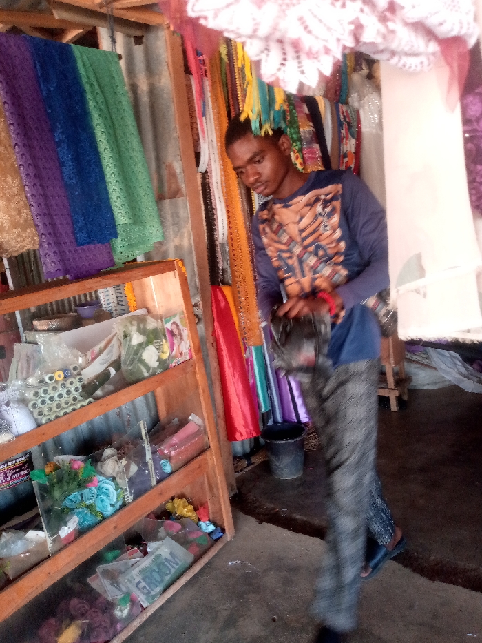 The image depicts the interior of a retail shop, likely a fabric and haberdashery store, situated in the city of Maigizo, Nigeria