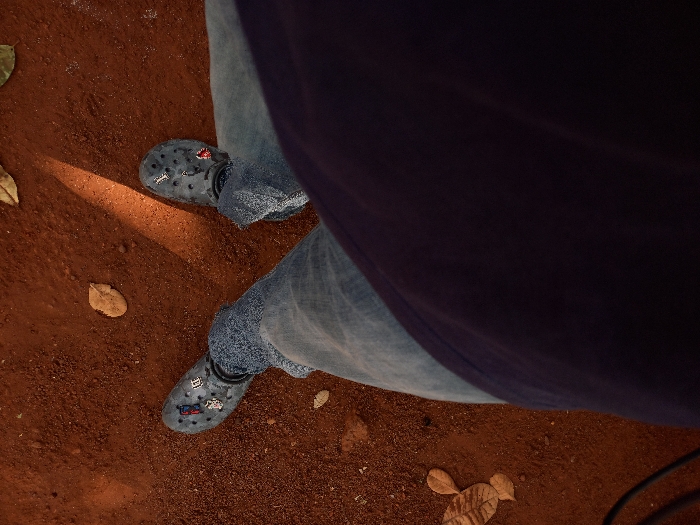 A high-angle view captures the lower body of an individual standing on reddish-brown earth in Oturkpo, Nigeria