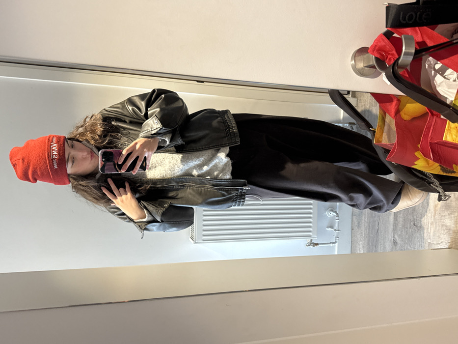 The image displays a young female posing for a mirror selfie within an indoor domestic setting in the city of Hull, United Kingdom. The individual, seen from head to upper calves, wears a red knit beanie with a white "VANS" logo and checkerboard pattern, a dark grey or black faux leather bomber jacket, a light grey textured long-sleeved top, and dark brown wide-leg trousers over light-colored shoes. Her right hand holds a dark-colored smartphone, positioned to capture the reflection, while her left hand is raised, displaying a two-finger 'peace' gesture. Her lips are pursed. In the background reflection, a white vertical domestic radiator with connecting pipes is affixed to a light-colored wall. The flooring visible is a light-toned wood or laminate. To the bottom right, outside the mirror's main reflection, a black bag featuring yellow sunflowers and other red and white bags are partially visible beside a white door frame with a silver handle.