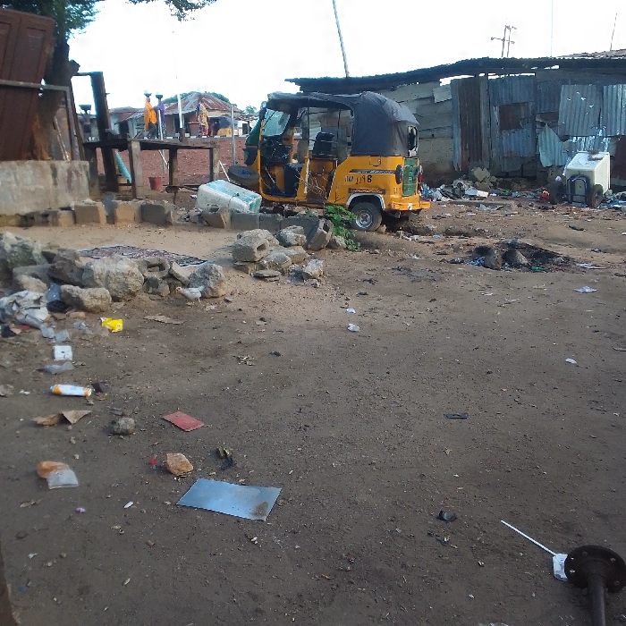 The image depicts an unpaved, debris-strewn urban environment in the city of Unknown, Unknown, under an overcast sky
