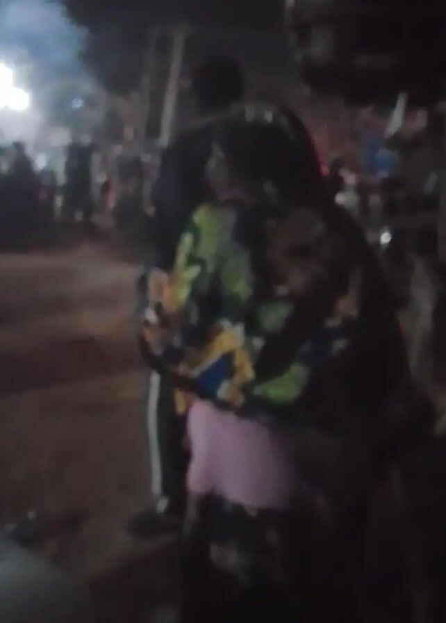 At night, a person wearing a colorful floral print jacket over a pink garment stands among a crowd of blurry figures. There is smoke in the air and some vehicle lights are visible in the background. Loud noises are heard. The scene is generally dark and unclear.