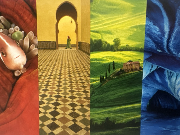The image is a vertical quadriptych displaying four distinct scenes. From left to right: 1. A stylized, light pink or orange fish is presented against a textured, soft red background, surrounded by pale, spherical objects and finger-like organic structures. 2. An interior architectural hallway with bright yellow walls and multiple receding pointed arches. The floor is covered in a geometric diamond tile pattern featuring shades of brown, beige, and dark gray. A figure wearing a green garment and red head covering stands in the furthest archway. 3. A panoramic view of rolling green hills under bright sunlight. A rustic, two-story house with a reddish-brown roof stands on a prominent hill, accompanied by several tall, slender cypress trees. 4. A deep blue, cavernous environment, characterized by abstract, textured formations suggesting an ice cave or grotto with varying depths and light reflections. This image is located in the city of Budva, Montenegro.