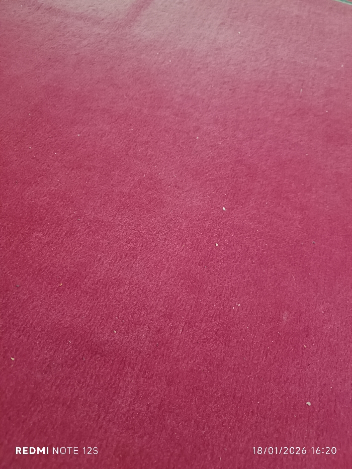 The image depicts a close-up, top-down view of a uniformly textured, reddish-purple fabric surface, possibly felt or a short-pile carpet. Numerous small, light-colored particulate specks are scattered across this surface. A subtle illumination gradient is present, with the upper portion of the frame appearing marginally brighter. No individuals, distinct objects beyond the fabric, actions, or interactions are visible within the frame. The image content provides no visual cues, such as landmarks or environmental features, to confirm a location within Andijan City, Uzbekistan. Embedded text in the bottom left corner reads "REDMI NOTE 12S," identifying the capture device. Embedded text in the bottom right corner displays "18/01/2026 16:20," indicating the date and time of capture.