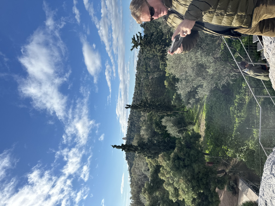This image depicts a panoramic view from an elevated position in Athens, Greece, likely from the Acropolis or Areopagus Hill, looking west-northwest towards the National Observatory of Athens situated on the Nymphs Hill. In the right foreground, a middle-aged Caucasian male, wearing dark sunglasses, an olive green puffer jacket, and brown corduroy pants, holds a dark smartphone horizontally with both hands, appearing to capture a photograph or video. He stands on an irregular, light-colored rocky surface. Below him, partially obscured by a silver metal handrail, another individual dressed in an olive green jacket and dark pants is visible on a set of metal stairs leading downwards. A dark metal fence runs along the edge of the foreground structure, separating it from the slope below. The midground features a verdant landscape comprising a steep hillside densely covered with a variety of trees, including numerous silvery-green olive trees, dark green cypress trees, and other deciduous and evergreen foliage. Green undergrowth is visible throughout the slope. A paved path is present on the lower left section of the midground. In the background, rolling hills extend, densely covered with vegetation. On the summit of the most prominent hill, the distinct cylindrical white/light-colored building with a domed roof of the National Observatory of Athens is clearly visible. The sky above is a bright blue, interspersed with scattered white cumulus clouds, indicating a clear and sunny day.