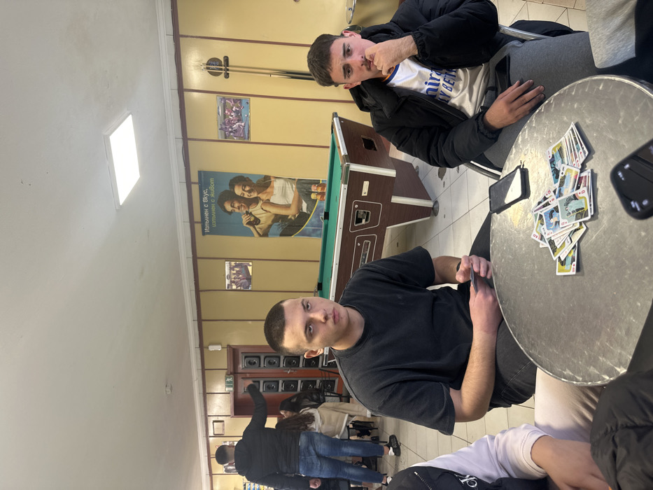An indoor recreational facility in Pravets, Bulgaria, features light yellow walls with a dark brown upper trim and a white ceiling with a single rectangular LED light fixture. The floor is covered with light-colored tiles. A green-felted billiards table with a dark brown and white base is positioned in the mid-ground, with a wall-mounted rack of pool cues to its right. A large vertical poster on the wall depicts a man and a woman holding Coca-Cola bottles, accompanied by Bulgarian text "ИЗПЪЛНЕН С ВКУС, ИЗПЪЛНЕН С ЖИВОТ" (Full of taste, full of life). To the left of the poster, a wooden door with a green "EXIT" sign is visible, adjacent to a vertical panel consisting of multiple square speaker grilles. In the foreground, a young male with a short buzz cut, dressed in a dark grey t-shirt and dark trousers, is seated centrally at a round, metallic table. He holds several playing cards in his hands and gazes directly forward. To his right, another young male with short dark hair and a mustache, wearing a black puffer jacket over a white long-sleeved shirt with a Real Madrid crest and "Fly Emirates" logo, sits leaning forward, his right hand positioned near his mouth. A stack of diverse playing cards and a black smartphone lying face-down are visible on the table between these two individuals. A third person, partially visible on the far left, wears a white shirt with a black "CK" logo and a black puffer vest. In the mid-ground, a male in a black puffer jacket and blue jeans stands with his back to the camera, his right arm extended towards the vertical speaker grille panel. A female in a light-colored jacket is seated nearby, facing away from the camera. Additional blurred figures are present in the background, suggesting a social gathering within the facility.