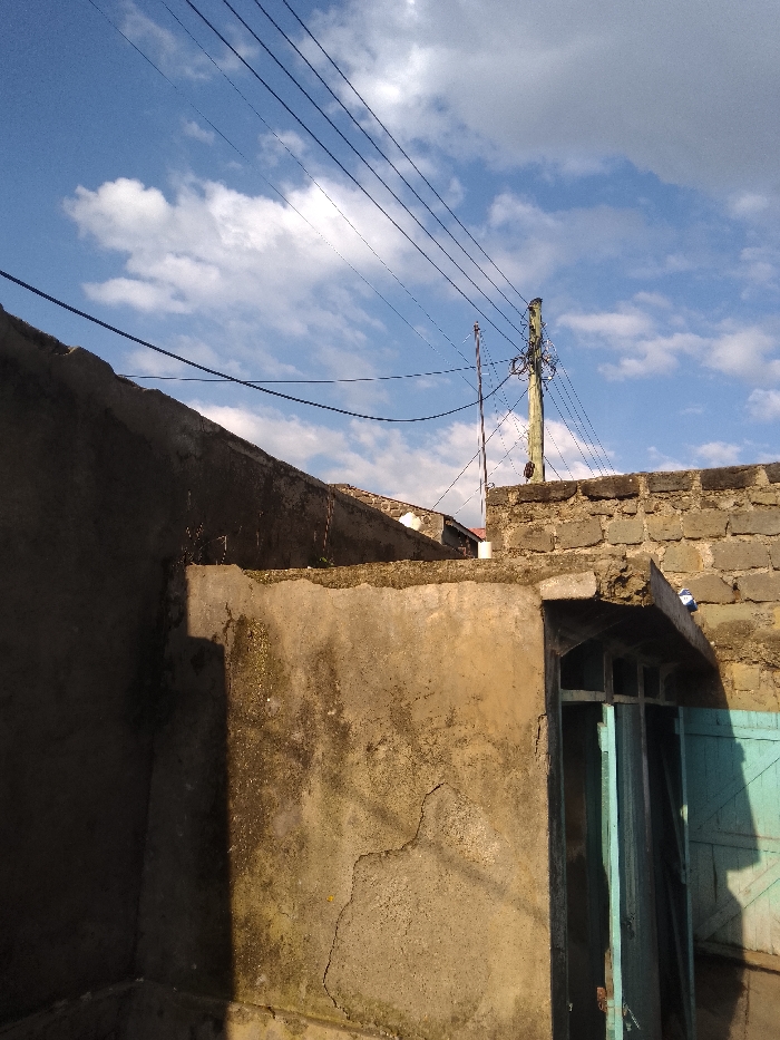 The image displays an outdoor urban environment within Njoro ward, Kenya, under a blue sky with scattered white cumulus clouds. Direct sunlight illuminates the scene, casting distinct shadows. In the foreground, a weathered, light brown concrete wall with visible discoloration and a prominent crack in its lower right quadrant occupies the left side. Behind this, a darker concrete wall, topped with sparse vegetation, is partially visible. To the right, a wall constructed from rough-hewn stone blocks rises. A wooden utility pole, heavily laden with numerous black wires, stands above the stone wall in the upper right quadrant. Multiple black utility wires traverse the sky horizontally and diagonally, connecting to this pole. A slender metallic rod or antenna is also present near the utility pole. In the lower right, a doorway with a light blue metal frame and a partially open, matching light blue door or shutter is visible, topped by a small concrete overhang. A crumpled white object rests on the stone wall directly above the doorway. No individuals or specific actions are depicted.