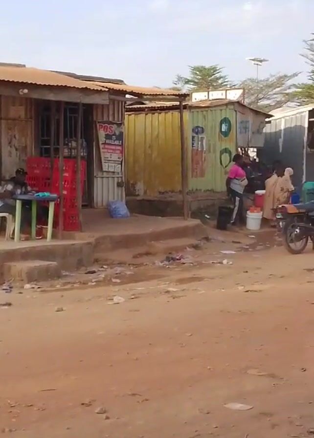 The video depicts a scene on a dirt road in what appears to be a small town or village. Several small, rudimentary shops or stalls line the road. Some appear to be constructed from corrugated metal. People are gathered at some of the stalls. Several motorcycles are parked nearby. Two people, a woman in a green and black checkered dress and a younger person wearing a gray shirt and patterned shorts, walk towards the camera. The environment is dusty and somewhat littered with debris. A utility pole with power lines is visible in the background. The sky is mostly clear.