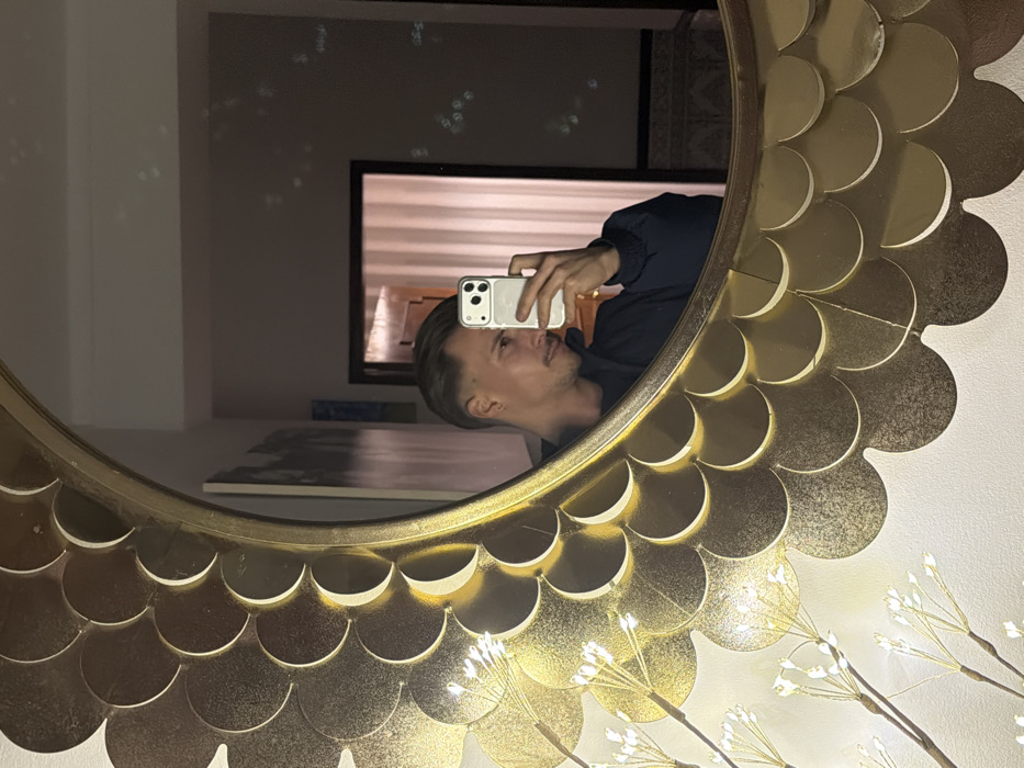 A person is taking a selfie in an ornate, gold-colored, circular mirror. The mirror's frame is adorned with a decorative, overlapping pattern resembling scales or petals. Reflected in the mirror is a television screen and a table with books or other items on it. The person is holding a smartphone, capturing their reflection within the mirror's frame. Lights or decorative branches are positioned to the right of the mirror.