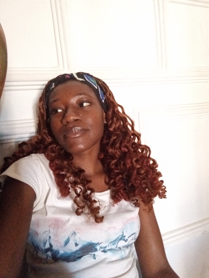 - "An adult individual with dark skin and long, reddish-brown curly hair is depicted in a medium close-up, situated indoors against a white paneled wall" by FM-qi6h23, licensed under CC BY 4.0