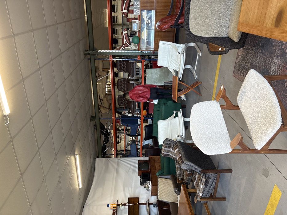 The image displays an interior view of a furniture store or warehouse located in Kostinbrod, Bulgaria. The scene is brightly lit by overhead fluorescent lights, illuminating a concrete floor marked with yellow lines. A single individual, seen from behind, wears a red jacket, black trousers, and carries a white bag on their left shoulder, standing centrally in the mid-ground and facing away from the viewer towards various furniture items. Numerous pieces of furniture are arranged throughout the space. In the immediate foreground, a white bouclé upholstered armchair with wooden arms and legs is prominent. Behind it, a plaid upholstered armchair with a dark wooden frame is visible to the left. To its right, two white upholstered lounge chairs with metallic, curved frames are positioned, one facing left and the other right, separated by a small wooden folding table with an X-shaped base. Two green upholstered sofas are situated further back. The background features tall, multi-tiered metal shelving units laden with additional furniture. On the lower shelves, multiple dark brown leather office-style chairs and blue upholstered armchairs are visible. Various other furniture components and chairs are stacked on higher shelves. To the right, a long, low wooden cabinet with glass display sections is present, with a green spherical object placed on its surface. On the far left, a wall-mounted wooden shelf unit holds small objects, and a wooden side table with a vintage radio and a decorative item is positioned nearby. A large white tarpaulin or curtain covers a section of the wall on the left side of the room.