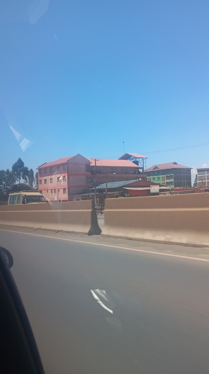 From a moving vehicle, a view of buildings beyond a highway barrier. The buildings, with red and green roofs, stand against a clear blue sky. Utility poles and wires are visible overhead. A yellow bus is partially visible to the left. The foreground shows the road surface and a glimpse of the vehicle's interior.