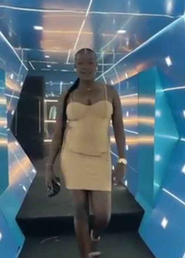 A woman is walking down a hall with blue and orange lights. The hall has a futuristic look. The woman is wearing a beige dress and heels. She is smiling and waving at the camera. She has her hair in a long braid. She is wearing jewelry. The hall has a dark floor. There is a door on the left.