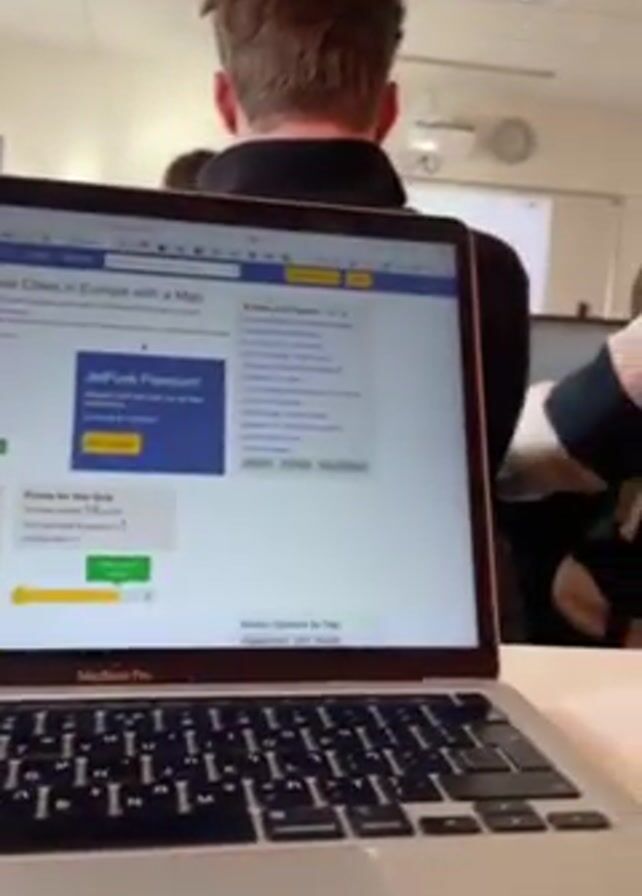 MacBook Pro laptop in a classroom setting. On the screen is the JetPunk website displaying a quiz titled "100 Biggest Cities in Europe with a Map." The laptop is open and the keyboard is visible. A person with short brown hair and wearing a dark jacket is standing behind the laptop. Other students and monitors are visible in the background, indicating it is a classroom environment. The lighting is bright, suggesting an indoor setting.