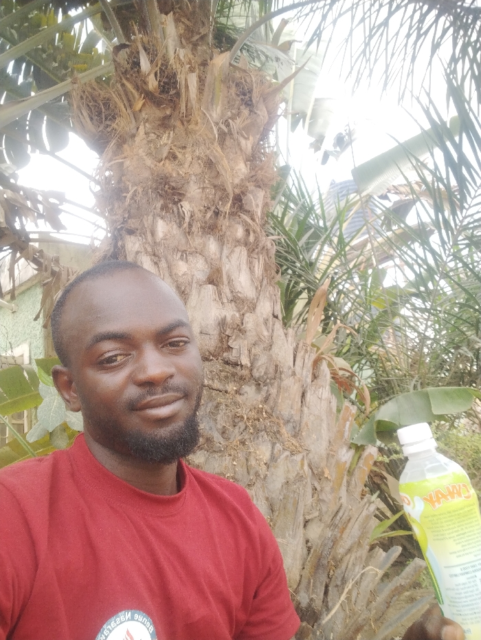 An adult male with dark skin, short dark hair, and a dark beard is depicted from the chest up, facing the viewer with a slight smile. He is wearing a red short-sleeved t-shirt that displays a partially visible, reversed white logo or emblem on the left chest, including the word "Benue". In his right hand, he holds a clear plastic bottle with a white cap, containing a light green liquid. The bottle's label, partially visible, features green and white branding with the text "YAWAY". The background is dominated by the textured, brown, fibrous trunk of a palm tree, likely an oil palm, with various green palm fronds and other foliage visible around it. Portions of a light-colored structure, possibly a building or wall, are visible in the upper left and right corners. The scene is outdoors and appears to be in daylight. The precise location within Abuja, Nigeria, is not identifiable from the visual evidence.
