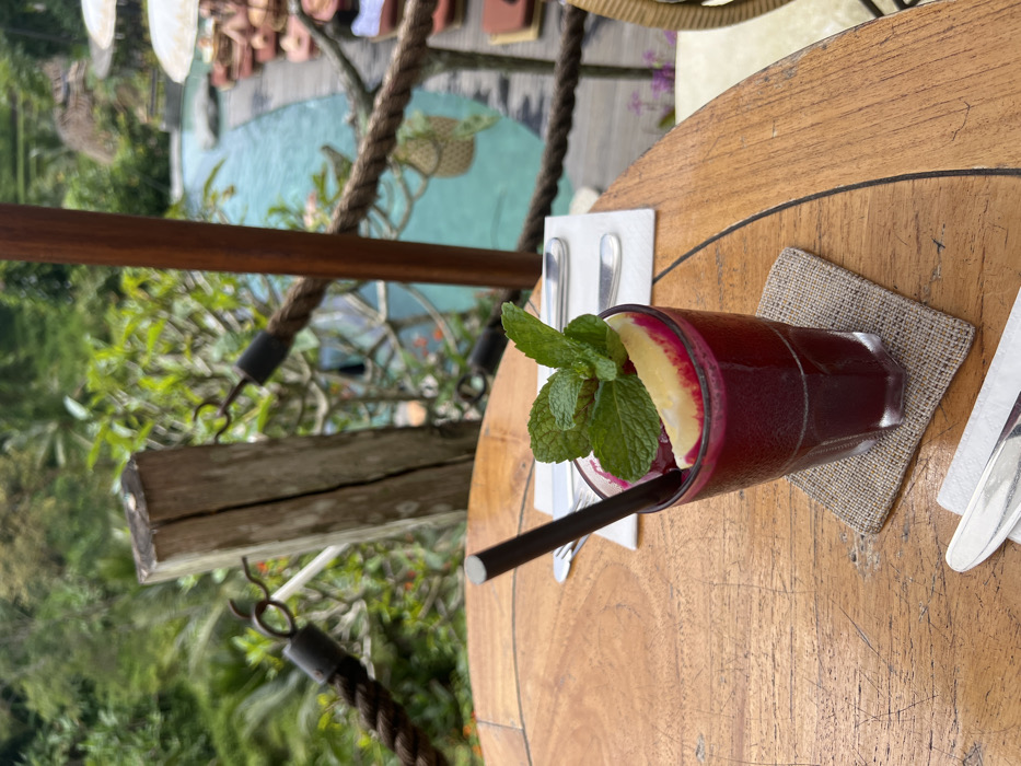 A vibrant red juice or smoothie sits on a woven coaster atop a wooden table. Garnished with a lemon wedge and sprig of mint, a dark straw protrudes from the glass. Cutlery rests on napkins beside the drink. In the background, a textured rope and wooden beam frame a lush green landscape with a blue pool, providing an idyllic outdoor setting.