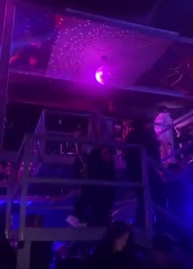 nightclub with a disco ball hanging from the ceiling and people dancing and socializing on a raised platform with stairs