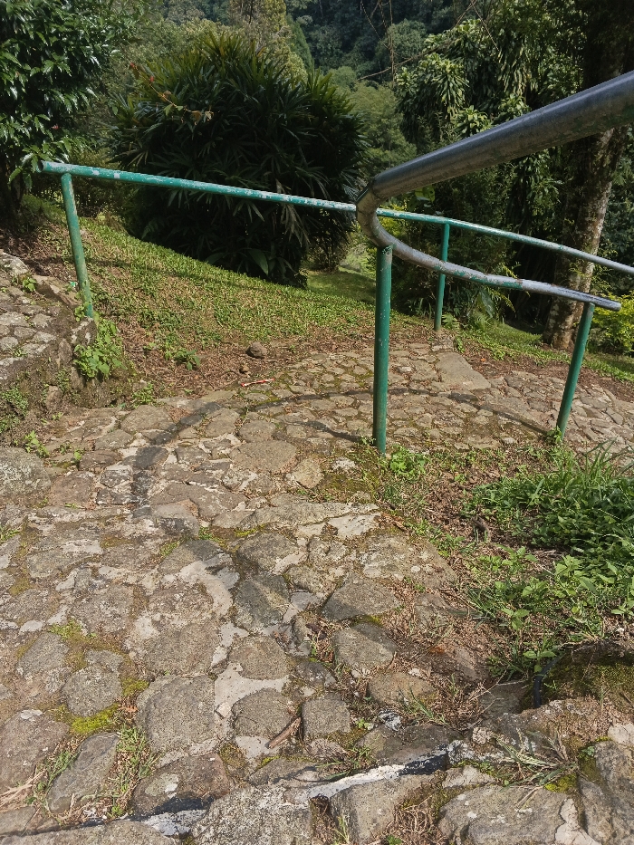The image displays an outdoor scene in Tamghas, Nepal, featuring a stone pathway descending through a vegetated area. The pathway is composed of irregularly shaped, greyish-brown stones set into mortar, with patches of green moss and grass growing between them and along the edges. A weathered metal handrail with a silver-colored horizontal bar and faded green vertical support posts follows the path's descent on the right side. A shorter, fully green metal bar runs along the left edge of the path. The surrounding environment consists of lush green vegetation, including grassy slopes, dense bushes with prominent spiky leaves in the midground, and numerous trees with green foliage in the background, suggesting a natural or park-like setting. The scene is illuminated by natural daylight, casting shadows from the railing onto the path. No individuals or active subjects are visible.