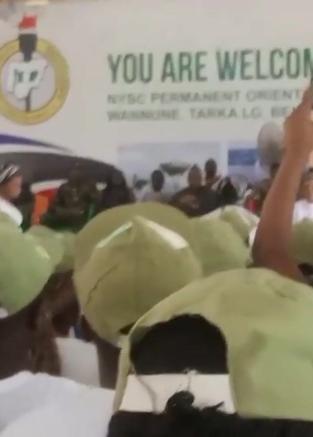 large group of people, mostly wearing white shirts and green caps, sitting in an indoor space. A banner in the background reads "YOU ARE WELCOME TO NYSC PERMANENT ORIENTATION CAMP WANNUNE, TARKA LG, BENUE STATE". Some people in the audience are using their phones to take pictures or videos of the scene in front of them. There are a few people standing at the front, some of whom are wearing white clothing, possibly addressing the audience. The room appears to be a large hall with a ceiling fan visible in the background. There's music playing, but the source isn't visible.