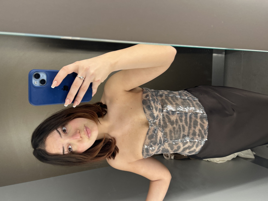 An image captured in a changing room in Reichstett, France, depicts a young adult female reflected in a full-length mirror. The subject possesses medium-length, dark brown hair with lighter auburn highlights, parted centrally. Her facial expression includes slightly pursed lips, and she gazes directly at her reflection. She wears a strapless corset-style top featuring a leopard print pattern, heavily embellished with vertical rows of silver sequins. Below the corset, a long, dark, possibly black or dark brown, flowing skirt or dress bottom is visible. Her left hand, adorned with a silver-colored ring featuring a central stone on the ring finger and a French tip manicure, holds a blue-cased smartphone (identified as an iPhone due to the visible logo and camera configuration) at shoulder height, capturing the mirror selfie. The changing room environment consists of plain, dark grey or brown walls. A light-colored fabric item is partially visible behind the subject's left arm near the bottom left of the frame.