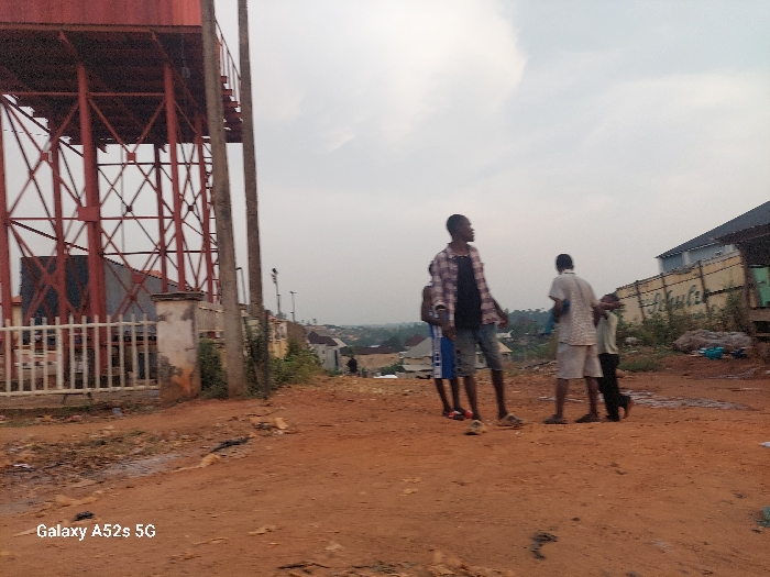 A dusty, reddish-brown dirt road scene features several young people, appearing to be boys, standing together. One is taller and wears a plaid shirt over a dark top and shorts. A tall metal water tower stands to the left, behind a white gate. In the background, there are buildings and signs of a town. The sky is overcast. The scene conveys a sense of poverty. The words "Galaxy A52s 5G" are visible in the lower left corner.