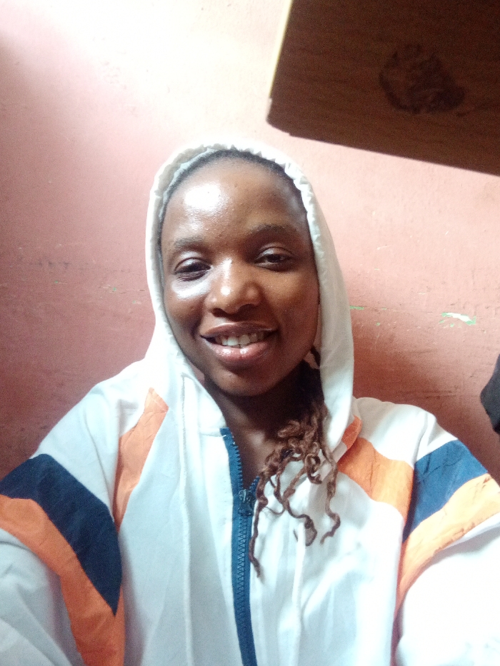 A close-up portrait shows a young adult female with dark skin, positioned centrally and facing directly forward, smiling with her upper teeth visible. She is wearing a white hooded jacket with orange and dark blue horizontal stripes on the sleeves and a visible blue zipper down the front. Strands of her curly brown hair emerge from beneath the white hood, which is pulled over her head. The background is a weathered, light reddish-brown wall exhibiting some minor discolouration and lighter patches. In the upper right corner, a dark, angular object, possibly a shelf or fixture, is partially visible, casting a shadow onto the wall. The exact location within the city of Nsukka, Nigeria, cannot be determined from the visual information provided.
