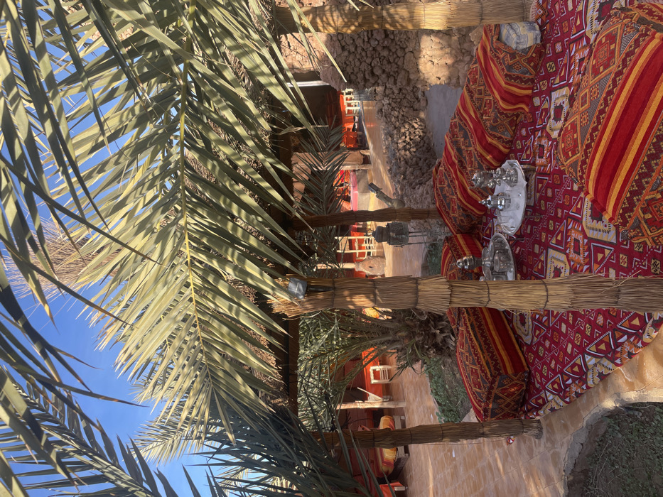 A vibrant outdoor scene unfolds under a clear blue sky. Palm fronds fill the left frame, framing a cozy seating area. Patterned cushions adorn a reddish-orange rug, centered with a silver tea set. Beyond, a terracotta structure reveals glimpses of an indoor dining space with orange seating. The area is further decorated with hanging lanterns and earthy tones.