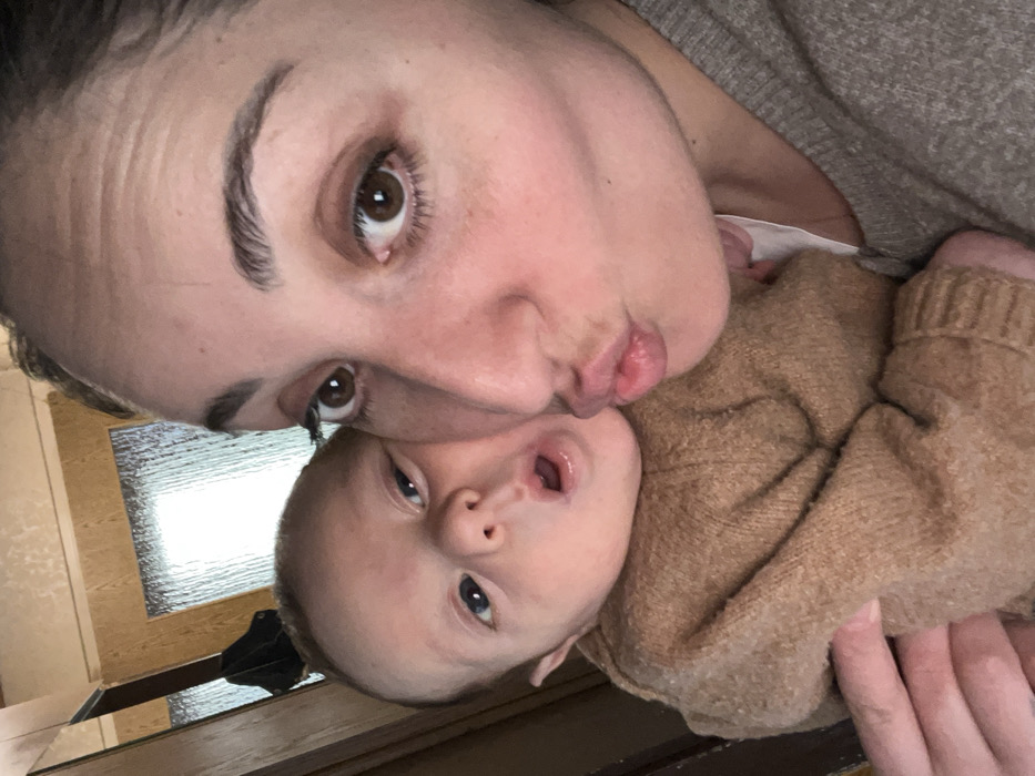 An adult female and an infant are depicted indoors in Wüstenrot, Germany