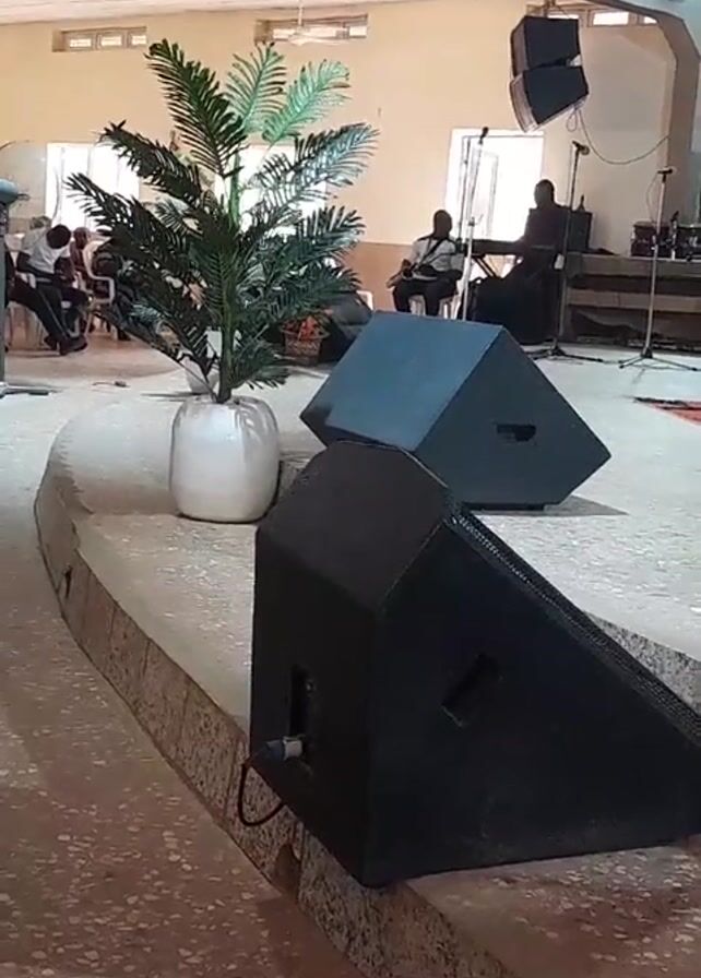 The video depicts a church stage in a well-lit, spacious room. Two large, black, angled speakers dominate the foreground, flanking a potted plant with feathery, green leaves in a white pot. In the background, several people are seated, while two men, one with a guitar and another at a keyboard, appear to be rehearsing or preparing for a musical performance. Additional audio equipment, including microphones and drums, is visible further back on the stage. The stage itself has a curved edge, with a textured surface. The room features ceiling fans, windows, and overhead lighting.