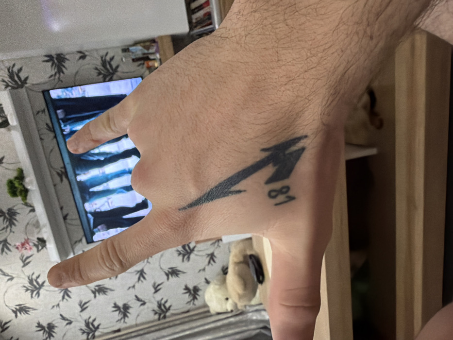 A human right hand is prominently featured in the foreground, executing a "rock on" gesture with the index and pinky fingers extended. A black tattoo is visible on the dorsal side of the hand, between the thumb and index finger, depicting a stylized lightning bolt or arrow shape, with the number "81" tattooed vertically alongside it. The hand is positioned above a light-colored wooden table. In the mid-background, a flat-screen television displays the lower extremities of multiple individuals, indicative of a performance or music video. The wall behind the television is covered with wallpaper featuring a pattern of dark foliage and subtle pink floral elements. Above the television, a white wall-mounted shelf holds small potted plants. To the left, a light-colored teddy bear rests on a surface with a dark, elongated object in front of it, near striped curtains. To the right, a white cabinet or shelving unit is partially visible, holding several bottles. This scene takes place in a residential interior in Radomir, Bulgaria.