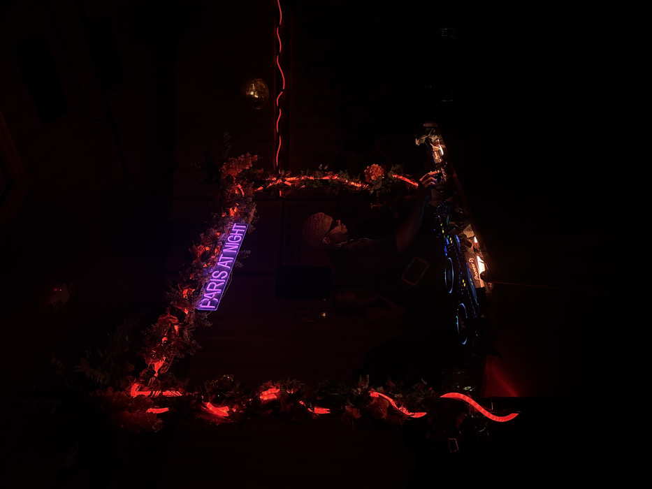 The image captures a dimly lit indoor nightlife venue in West Hollywood, United States. A male-presenting DJ with light-colored hair, wearing sunglasses and a dark short-sleeved shirt, is positioned centrally behind a "Pioneer DJ" mixing console. His hands are actively engaged with the controls of the equipment, illuminated by its operational lights. Above the DJ, a purple neon sign spells out "PARIS AT NIGHT" in capital letters. This sign is integrated into a decorative archway festooned with red-lit faux foliage, including visible red roses, creating a frame around the DJ booth. In the upper right background, a wavy red strip light extends horizontally, and a small, reflective disco ball hangs. The predominant lighting is red and purple, casting deep shadows across the scene, indicating an evening or night event environment.