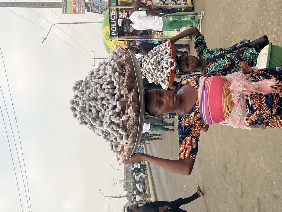 The image displays a bustling street scene in Egan, Nigeria, under an overcast sky. In the foreground, an adult female is centrally positioned, wearing a vibrant patterned dress and a striped fabric wrap around her torso. She carries a large, silver-colored metal tray on her head, which is piled high with numerous individually wrapped dark-brown, likely caramel-colored, items. Her left hand is raised, supporting the tray. Her gaze is directed towards the viewer. To her right and slightly behind, a young female child, also facing the viewer, wears a green and black patterned dress. She carries a smaller, orange-red plastic tray on her head, laden with a conical pile of individually wrapped light-colored or greyish-white items, supporting it with her raised left hand. Both individuals are engaged in street vending, transporting goods on their heads. In the mid-ground, a man in dark clothing walks from right to left. Further in the background on the right, a green and yellow kiosk labeled "POLICE" is visible, along with a "GLO" advertisement. A man in a white polo shirt, green tracksuit pants with white stripes, and a white baseball cap stands near this kiosk. The wider environment includes numerous other pedestrians, utility poles with overhead power lines, and multiple advertising banners, including one for "WAEC JAMB," lining a paved road.