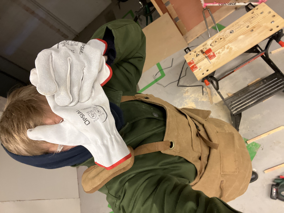 From a high-angle view, a person wearing a green jacket, blue beanie, and tan canvas apron holds up gloved hands in front of their face. The white gloves feature red trim and the brand "OPSIAL." In the background, a workbench with a wooden top and black frame is visible. Other elements include a pink and white bicycle frame, scattered wood scraps, and a concrete floor with green lines.