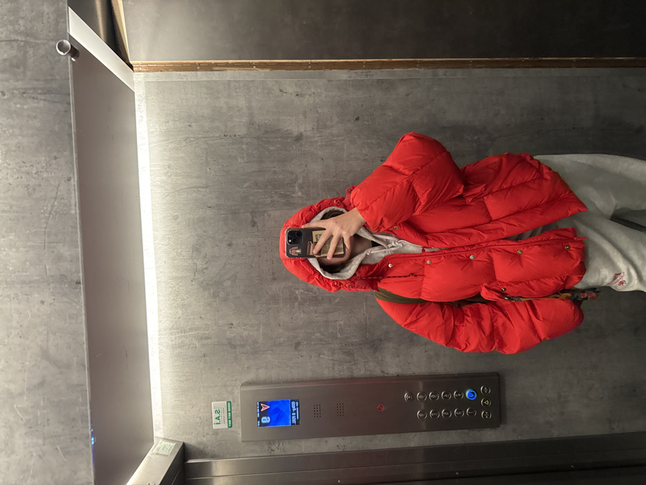 Inside an elevator, a person in a puffy red jacket and gray sweatpants takes a selfie