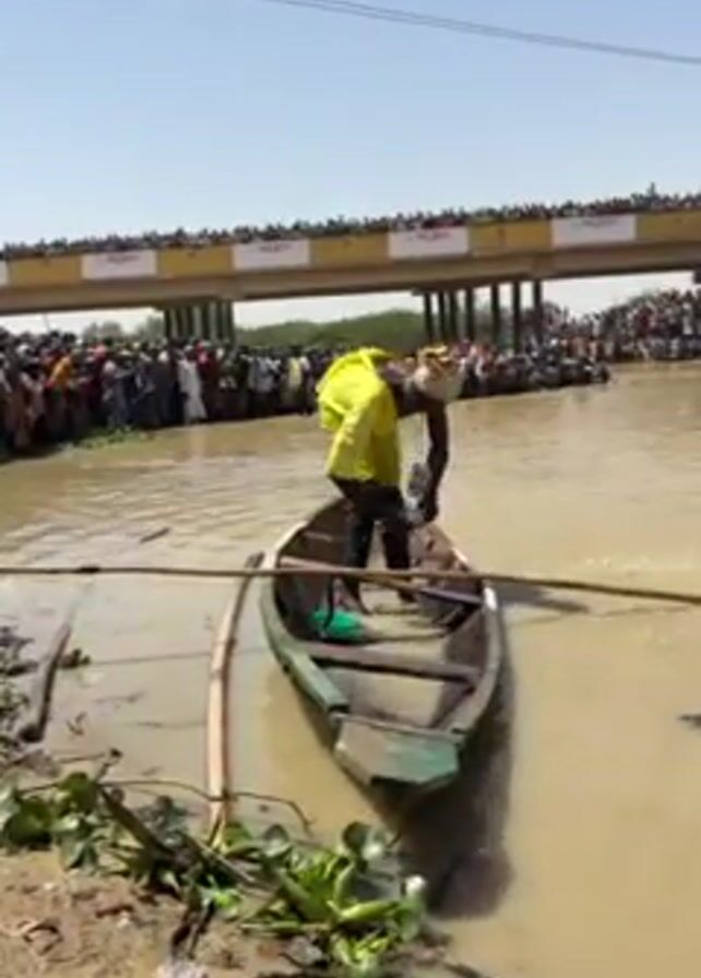 The video depicts a man in a yellow wetsuit and black boots, leaning into a small, green, wooden boat. He is using a long pole in the muddy water, possibly to fish. The boat is near a muddy bank with water hyacinth plants. In the background, a large crowd of people lines the banks of the waterway, and a bridge spans across. The sky is clear and bright.
