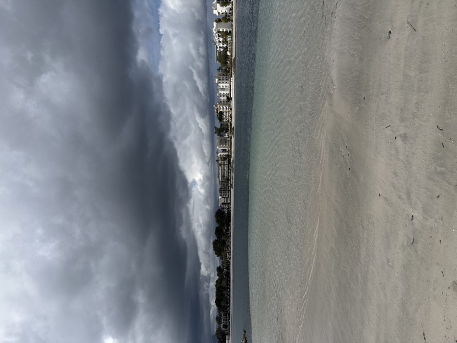 The image displays a coastal scene in Alcúdia, Spain, under heavy cloud cover. The foreground consists of a light beige sandy beach, exhibiting subtle wave patterns from receding water and scattered dark organic debris. Beyond the sand, calm, clear water stretches across the midground, appearing translucent and shallow near the shore with a light blue-green hue, gradually transitioning to a deeper blue-green further from the viewer. A small, dark rocky formation or breakwater is visible extending into the water on the far left. The background reveals a distant shoreline lined with dense, dark green trees, behind which a series of multi-story, light-colored buildings, characteristic of resort or residential structures, are visible along the waterfront. The sky is dominated by extensive, dark gray nimbostratus clouds, particularly dense in the upper left, with some lighter gray clouds and small patches of blue sky visible towards the right. No individuals, animals, or active interactions are present in the scene.