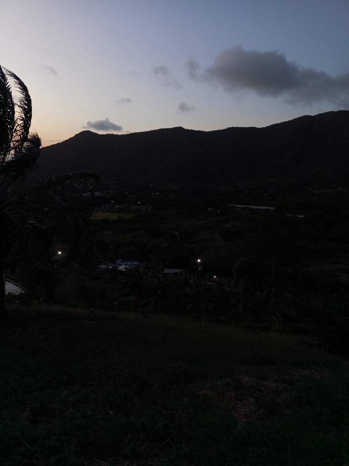 A landscape at dusk features a dark mountain range silhouetted against a dim sky with scattered clouds. A palm tree occupies the left foreground. Below the mountains, a valley is barely visible, punctuated by scattered lights suggesting dwellings. The foreground is dark and grassy, obscuring details of the terrain.