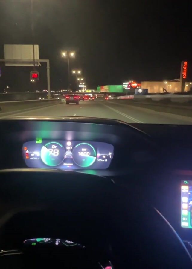 The camera shows the interior of a car driving at night on a lighted highway