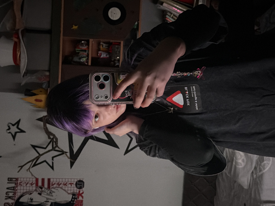 A selfie taken in a mirror reveals a person with purple-tinged hair and bangs. The person is wearing a dark-colored, long-sleeved shirt with a "BLACK BOX" tag attached. The phone taking the picture has multiple camera lenses. The background features a wall with star decals and a framed image of a woman with Japanese text. Also, a shelf cluttered with various objects is visible.
