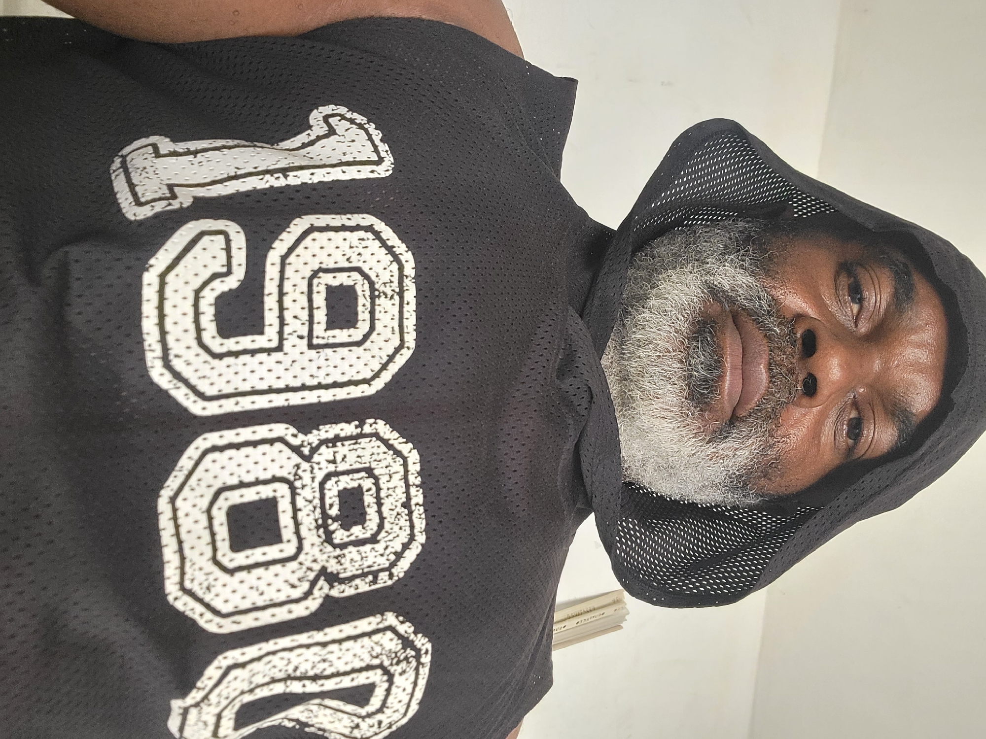 A person with a grey beard and dark skin is wearing a black hooded mesh shirt with "1986" printed in white on the front