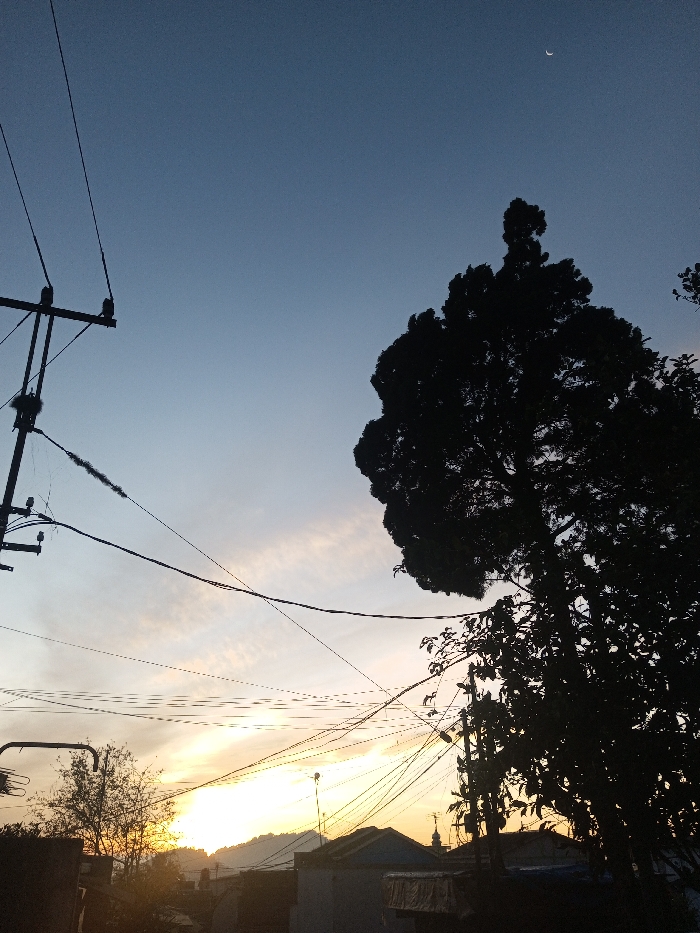 The image depicts an urban or semi-urban street scene at sunrise or sunset in Sa Hti Law (3), Myanmar, characterized by strong backlighting. The sky transitions from a deep blue at the top, featuring a slender crescent moon in the upper right quadrant, to a bright orange and yellow glow at the horizon. Wispy clouds are present in the mid-sky. In the foreground on the left, a utility pole with multiple cross arms and insulators is silhouetted, supporting a complex network of power lines and communication cables that traverse the frame. Some cables appear tangled or show minor debris accumulation. A large, dense tree with irregular foliage dominates the upper right, its form a dark silhouette against the sky. Below the tree and further into the midground, multiple low-rise buildings with varied rooflines and a visible antenna are silhouetted against the bright horizon. Distant mountains form a dark, rugged line along the horizon, obscuring the direct view of the sun. No individuals are visible.