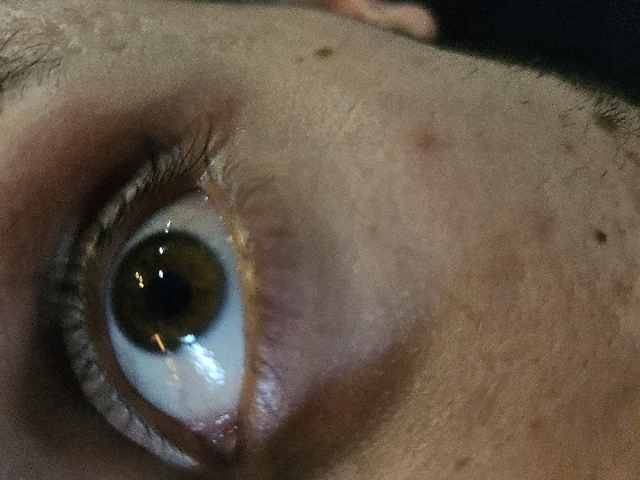 The image presents an extreme close-up of a human right eye and the surrounding facial skin, situated in Varna, Bulgaria. The eye features a distinct brown iris and a dark, circular pupil. The sclera is visible predominantly beneath the iris, indicating the subject's gaze is directed upwards. The cornea exhibits multiple distinct reflections of artificial light sources. Dark eyelashes are visible along the upper eyelid, and a section of the eyebrow is present above the eye. The adjacent skin displays a light to medium tone, characterized by visible pores, scattered small moles, and a singular red blemish on the cheek area. Short, dark facial hair stubble is discernible on the lower right portion of the depicted face. The lower eyelid appears slightly reddened near the nasal canthus. No further subjects, objects, actions, or specific environmental details beyond artificial illumination are present within the frame.