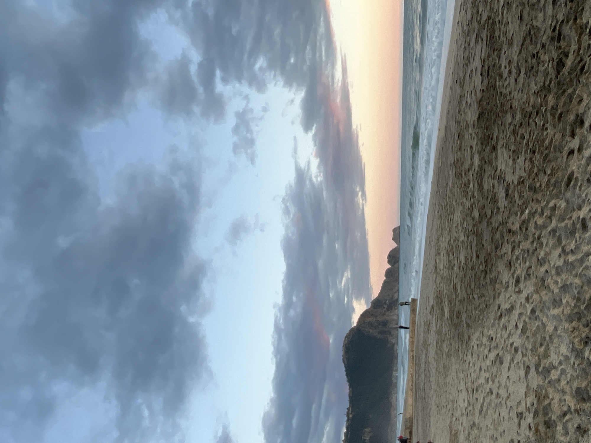 beach scene in Alanya, Turkey, at dusk. The sky is filled with dark, textured clouds on the left, transitioning to lighter clouds tinged with pink and orange hues towards the right, indicating the setting sun. In the distance, a dark, mountainous land formation is visible. The beach in the foreground appears sandy and textured, sloping upwards from the ocean. The ocean is marked by small waves. People stand along the shoreline.