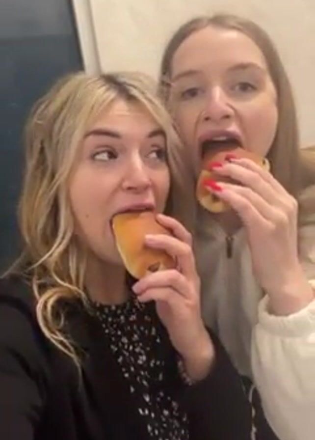 Two women are standing next to each other, facing the camera, and eating pastries. The woman on the left has blonde, wavy hair and is wearing a black blazer over a black and white patterned top. The woman on the right has long, straight, brown hair and is wearing a white hoodie. Both women are holding brown, filled pastries in their hands and taking bites. They are both looking at the camera with expressions of enjoyment. The background is a plain wall with a blue panel.