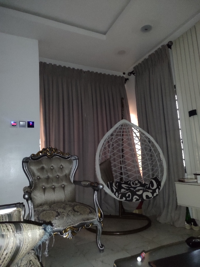 A luxurious living space features an ornate chair with gold trim and tufted upholstery, next to a hanging egg chair with a black and white patterned cushion. Gray curtains cover the windows, filtering sunlight. The room includes a white console and modern light switches on the wall. The decor suggests a blend of classic and contemporary styles.