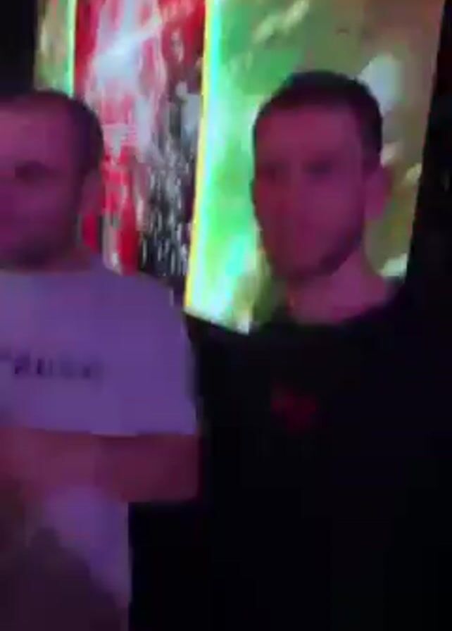 crowded nightclub with a brightly lit dance floor. People are dancing, and there are moving colored lights. One man, who appears to be bald or have a shaved head, is briefly shown in the foreground, smiling. The video is shaky and focuses on the lights and the crowd.