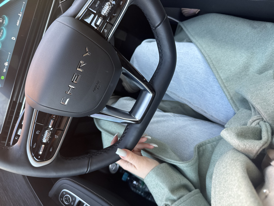 A first-person view depicts the interior of a Chery brand vehicle, likely situated in Orekhovo-Zuyevo, Russia